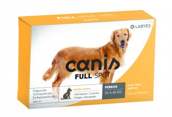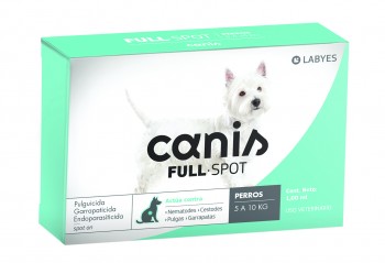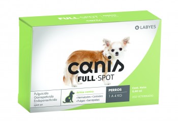 Canis Fullspot, endectocida de aplicación spot-on. Su efectiva formulación elimina los parásitos internos y externos que frecuentemente afectan a los perros. La Moxidectina, pertenece al grupo de las Milbemicinas, su concentración en Canis Fullspot le confiere efectividad contra garrapatas, además de los reconocidos efectos contra ácaros de la sarna y nematodes. El Praziquantel, derivado sintético de la isoquinolina-pirazina, posee actividad frente a parásitos trematodes y cestodes. El Imidacloprid, neonicotinoide con potentes efectos pulguicidas y rápido poder de volteo.