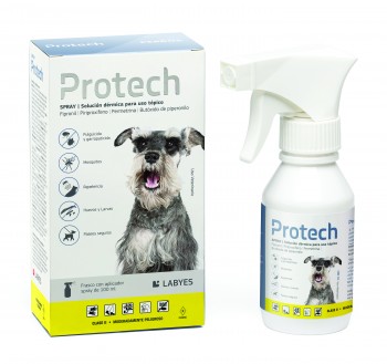 Protech spray, antiparasitario externo, cuya composición permite prevenir y tratar las infestaciones causadas por pulgas y garrapatas y ofrece control ambiental fotoestable de las formas inmaduras de parásitos externos, con efecto acumulativo y residual.